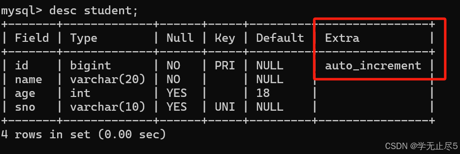 查看表结构时候,Extra列显⽰autoincrement 表⽰⾃增