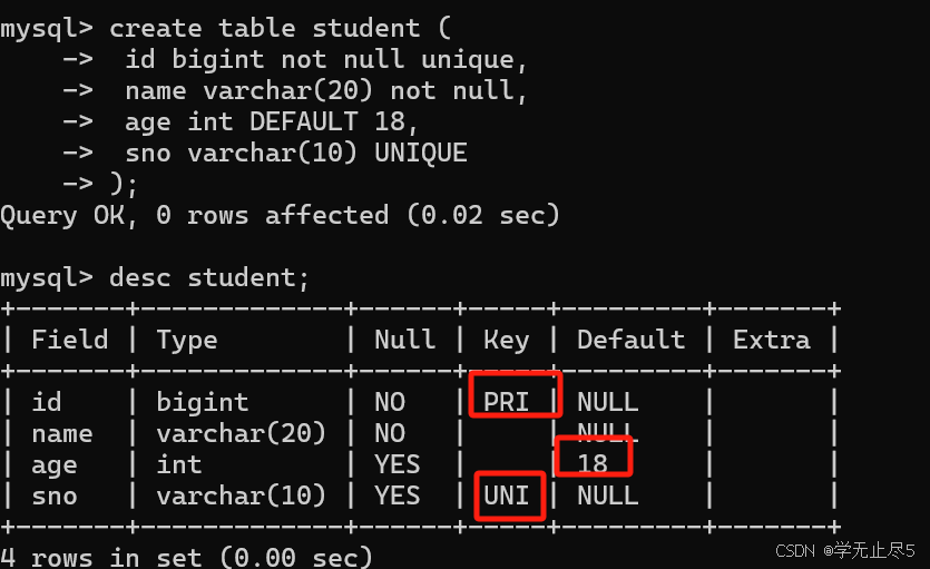 为ID列添加⾮空和唯⼀约束。 查看表结构,添加了⾮空和唯⼀约束之后Key列显⽰PRI表⽰主键