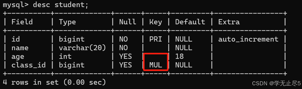 查看表结构,Key列的值为MUL表⽰外键约束的列