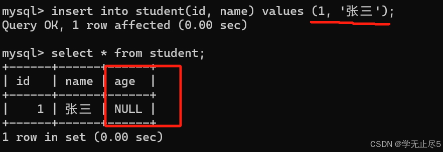 插⼊⼀条记录,没有设置默认约束时,不指定年龄的值时列为NULL