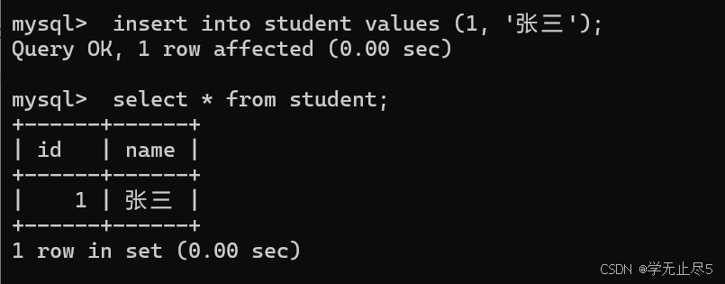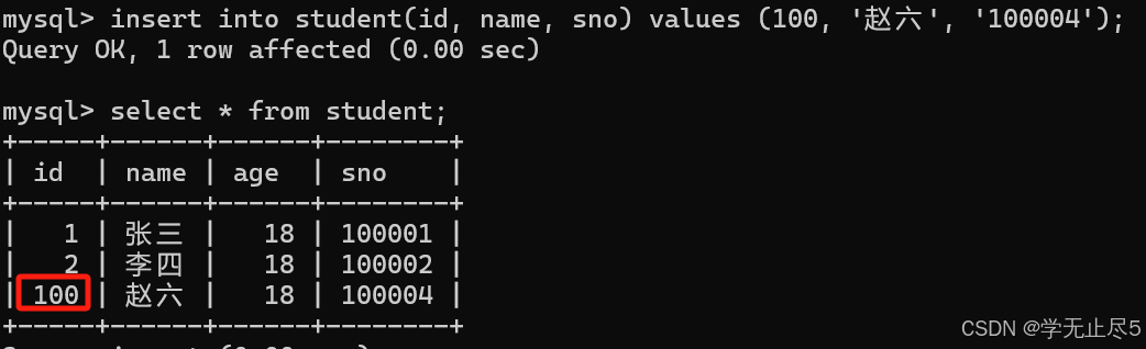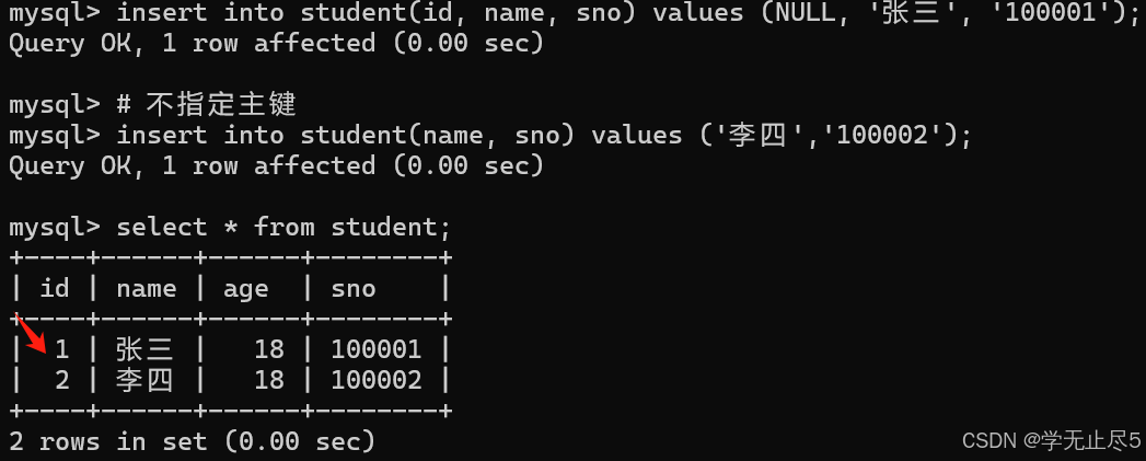 通常我们会把主键列设置为⾃动增⻓,让数据库维护主键值和插⼊数据时不设置主键列的值,我们插入第一个数据主键列的值为NULL,第二个数据不指定主键,最终主键列的值会自动生成。