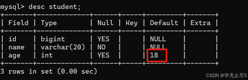 查看表结构,年龄列的默认值为18