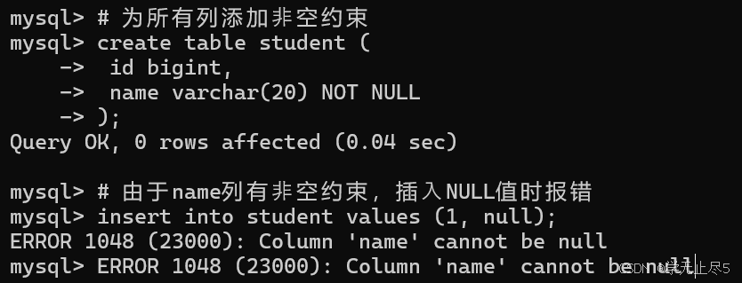 此时班级名为null,就没有意义了,所以我们要约束学⽣名的列不能为NULL。当name列为空时,他就会报错。