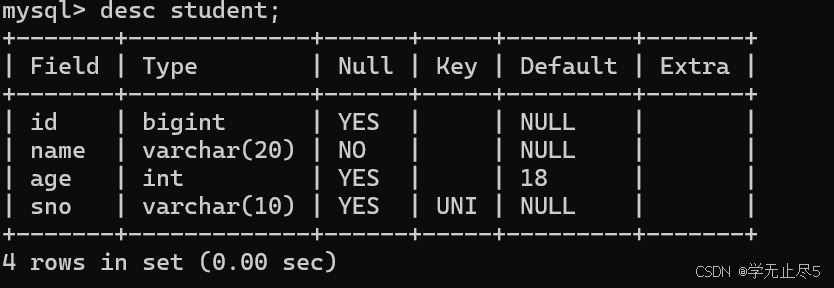 我们可以查看表结构,NULL列为NO表⽰值不允许为NULL,YES表⽰值可以为NULL