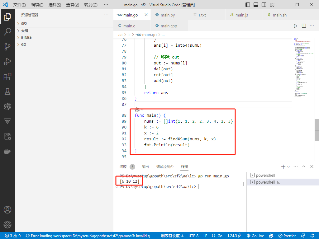 2025-05-12:计算子数组的 x-sumⅠ。用go语言,给定一个长度为 n 的整数数组 nums,以及两个整数 k 和 x。