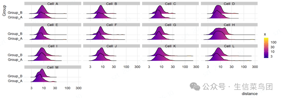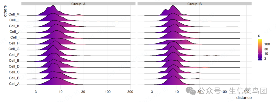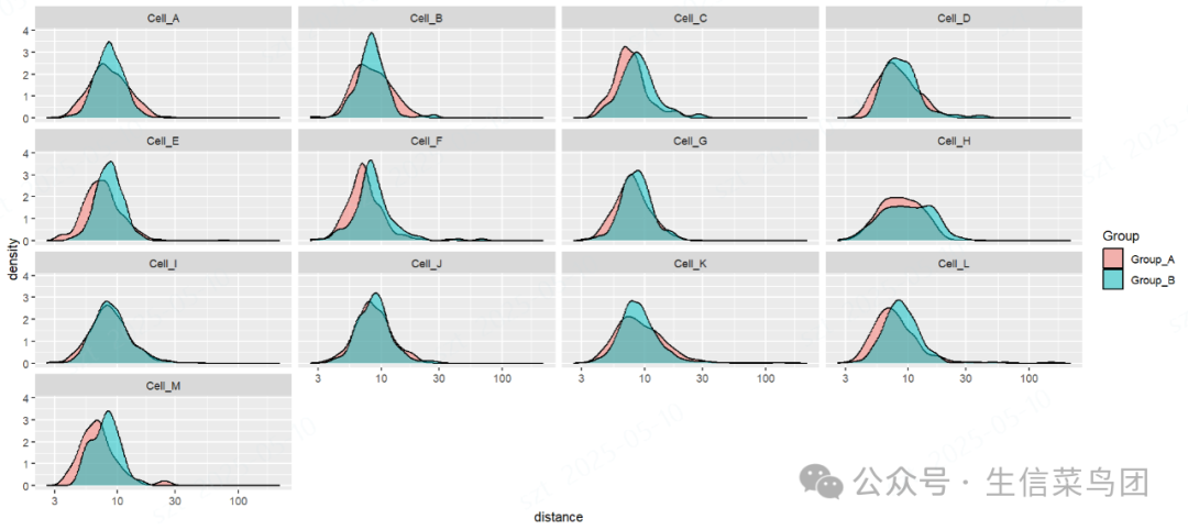 可以看到,Cell_A最近的细胞主要是Cell_M、Cell_H、Cell_E,而Cell_E、Cell_F、Cell_G等细胞在GroupB组中距离Cell_A更近。