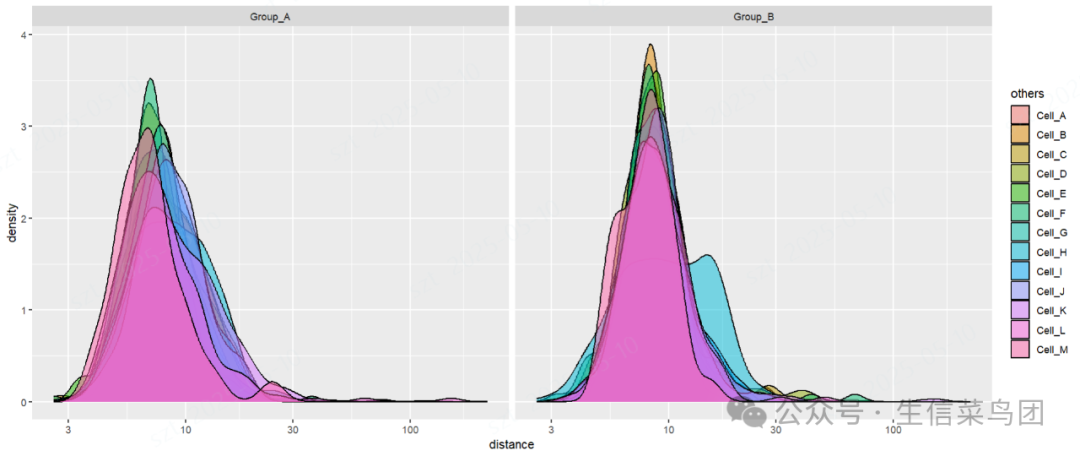 # 6 Cell_B Cell_I 10.49589 Group_A用于进一步绘图的数据是res_nn_df,其中center是中心细胞,others是中心细胞的最近邻细胞,distance是两个细胞的距离,Group是样本的组别。