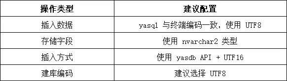 终端(UTF8) → yasql(GBK) → 服务端(GBK) → 存储为 UTF16若 yasql 与终端编码不一致,转换失败概率高,最终入库的 UTF16 编码是错误的。