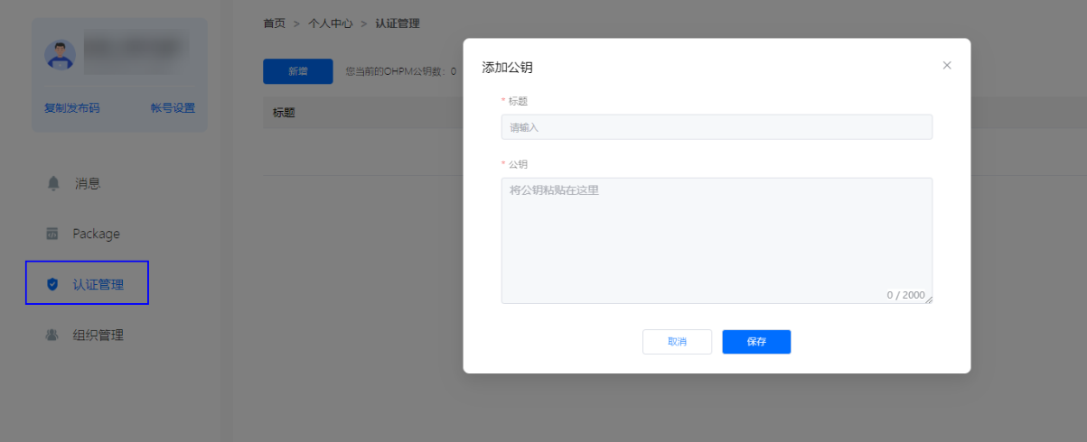 4. 登录OpenHarmony三方库中心仓官网,单击主页右上角的个人中心, 新增OHPM公钥,将公钥文件(mykey.pub)的内容粘贴到公钥输入框中。