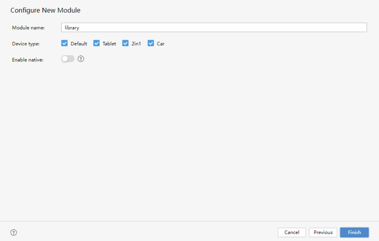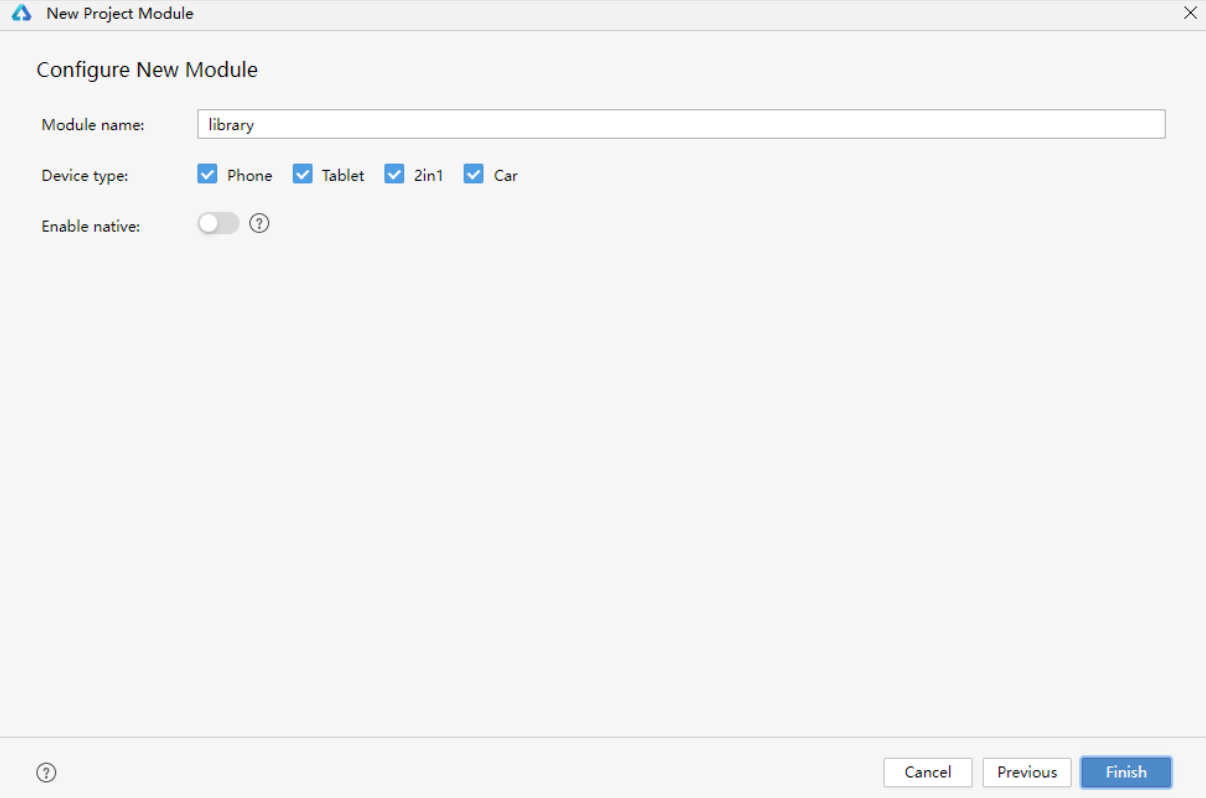 3. 在Configure New Module界面中,设置新添加的模块信息,设置完成后,单击Finish完成创建。