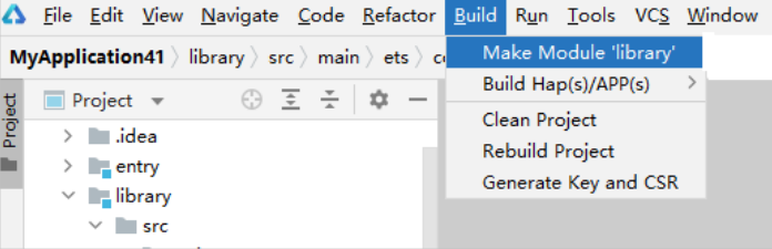 开发完库模块后,选中模块名,然后通过DevEco Studio菜单栏的Build > Make Module ${libraryName}进行编译构建,生成HSP。
