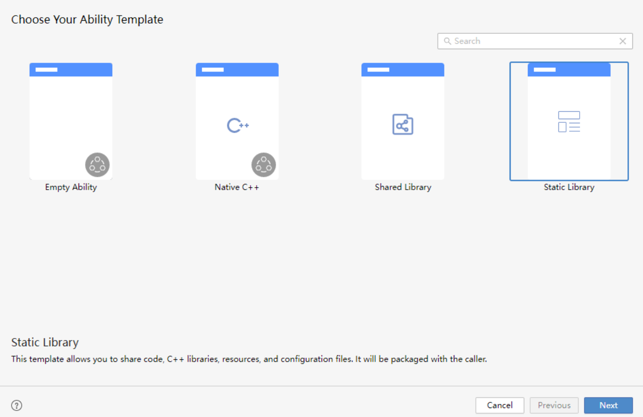2. 在Choose Your Ability Template界面中,选择Static Library,并单击Next。