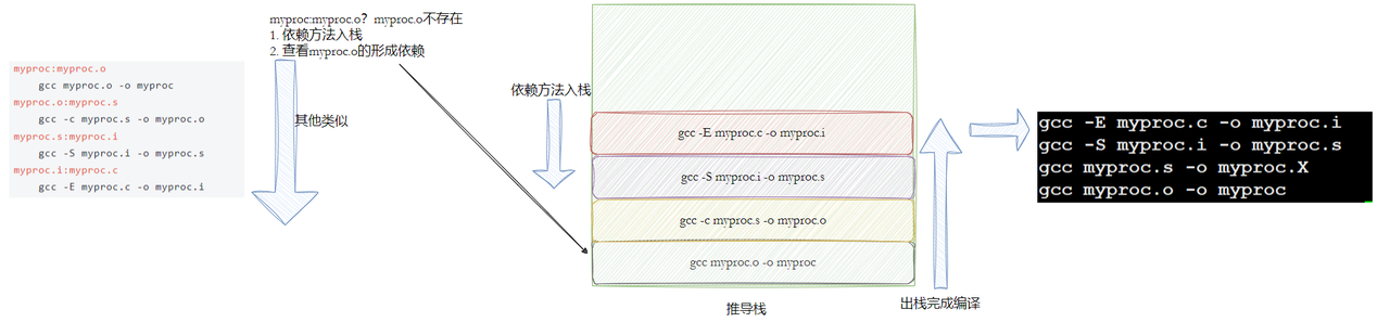 可以发现:makefile的编译顺序与我们书写的顺序是无关的,它会按照我们书写的第一个目标文件为目标,自动化推导出正确的顺序,生成目标文件。