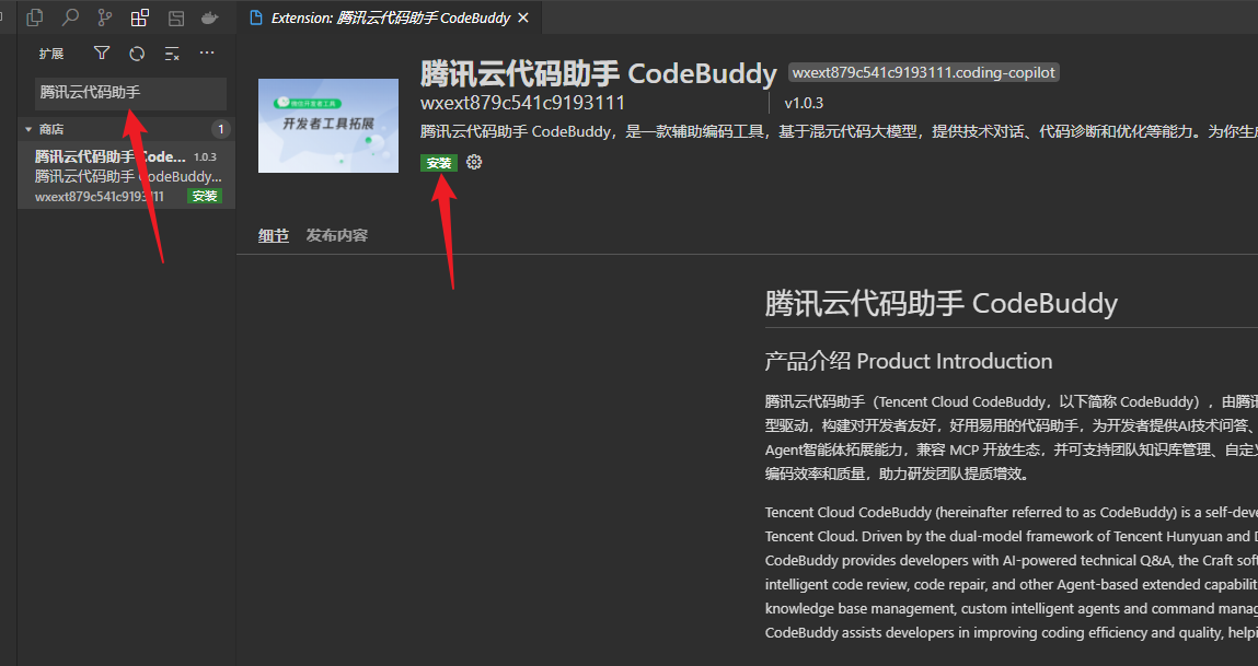 单击扩展区域图标,展开热门或者在搜索栏中输入腾讯云代码助手,单击腾讯云代码助手右边的安装,等待安装完成即可。