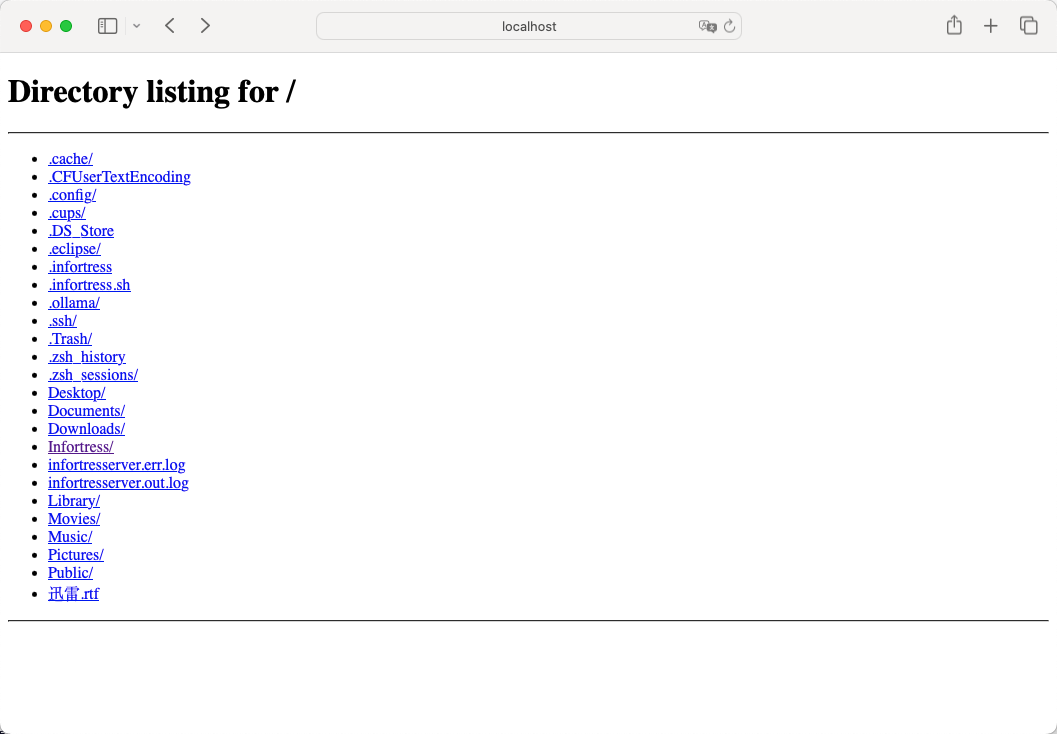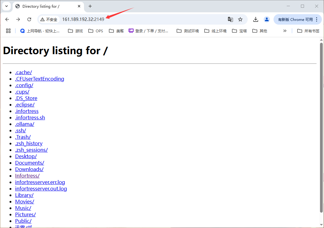 在任意外网设备上的浏览器中,输入http(s)://代理IP:代理端口 即可以访问内网http服务。若连接成功,将能够看到Mac电脑上HTTP服务的内容(如文件列表)。