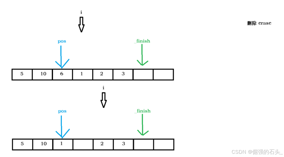 }**思路**:erase 函数用于删除指定位置的元素。首先进行位置合法性检查,然后将删除位置之后的元素依次向前移动一位,最后将 \_finish 指针向前移动一位。函数返回指向删除位置的迭代器。
