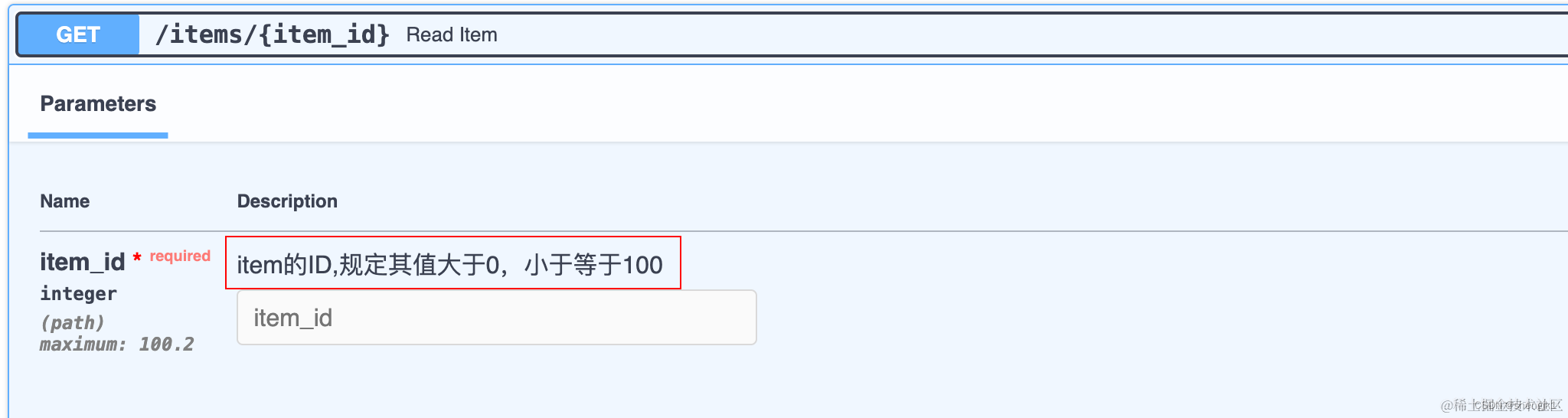 def read_item(item_id:int=Path(description="item的ID,规定其值大于0,小于等于100",gt=0, le=100)):
