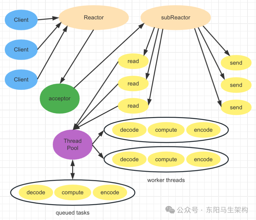 注意,这里subReactor线程只负责完成IO的read()操作,在读取到数据后将业务逻辑的处理放入到工作线程池中完成。若完成业务逻辑后需要返回数据给客户端,则IO的write()操作还是会被提交回subReactor线程来完成。这样所有的IO操作依旧在Reactor线程(mainReactor或subReactor)中完成,而工作线程池仅用来处理非IO操作的逻辑。