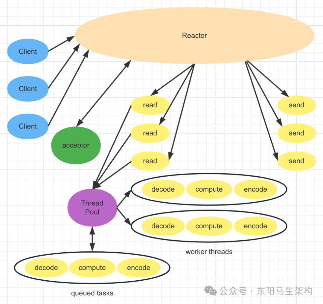 由于在单线程Reactor模式中,不仅IO操作在Reactor线程上,而且非IO的业务操作也在Reactor线程上进行处理,这会大大降低IO请求的响应。所以应将非IO的业务操作从Reactor线程上剥离,以提高Reactor线程对IO请求的响应。