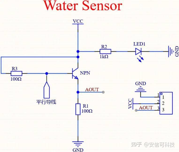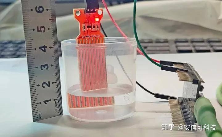 当平行铜线之间有水时,水浸没的高度不同,电流不同。铜线间的电阻根据水位的变化而变化。
