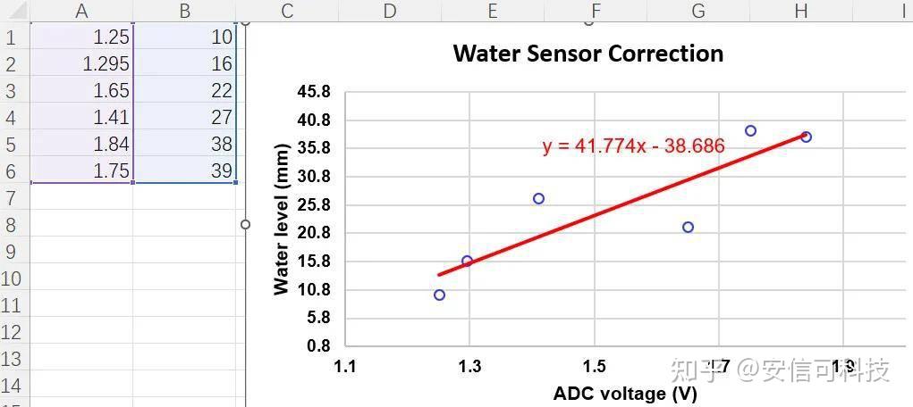 假设 ADC 读取电压(V)与水位高度(mm)为线性相关关系,对上述数据进行拟合。使用 Excel 软件进行拟合,获得拟合表达式 y = 41.774 x - 38.686。