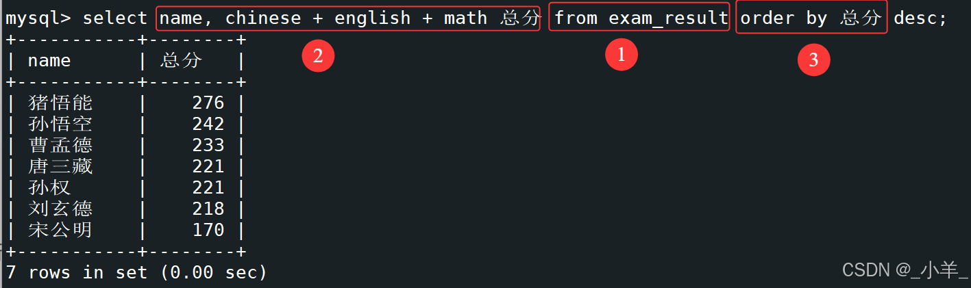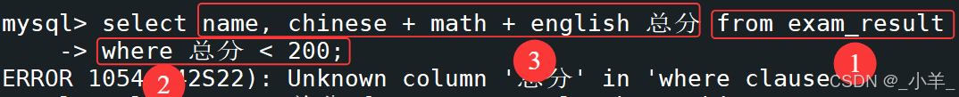 mysql> select name, math, chinese + math + english 总分 from exam_result