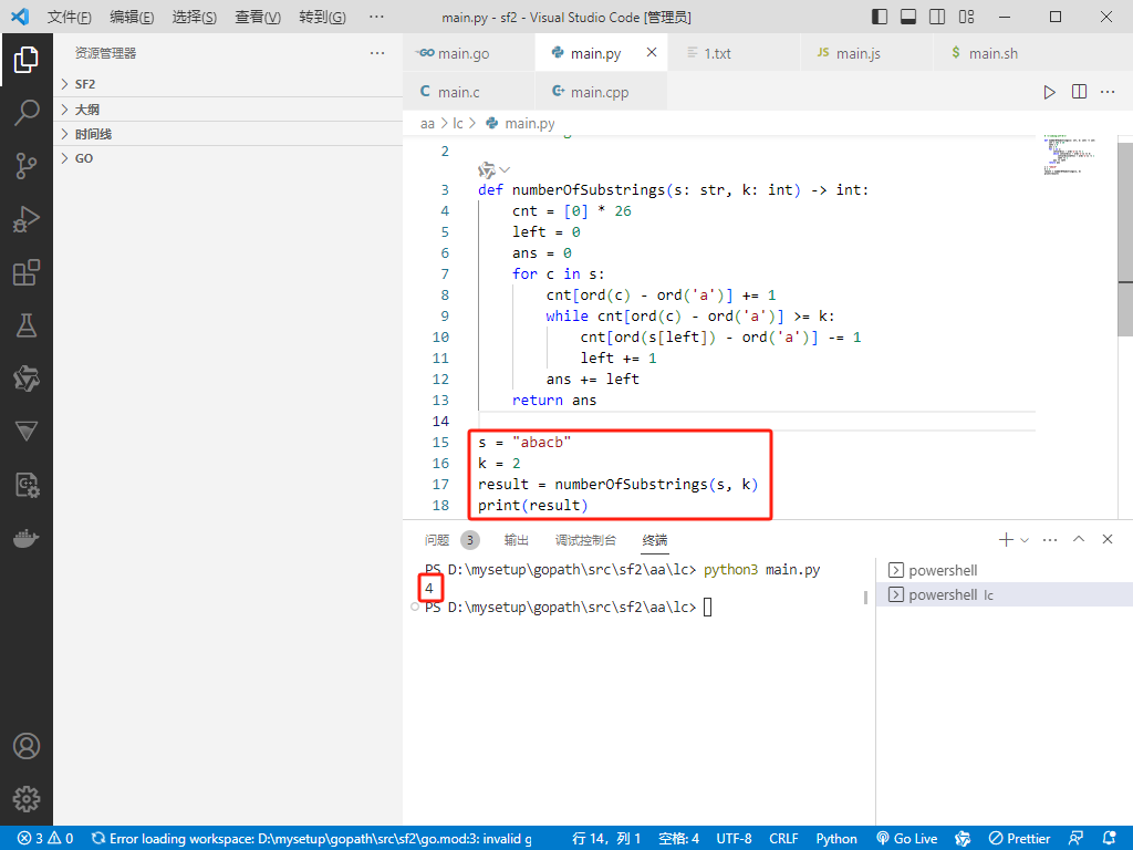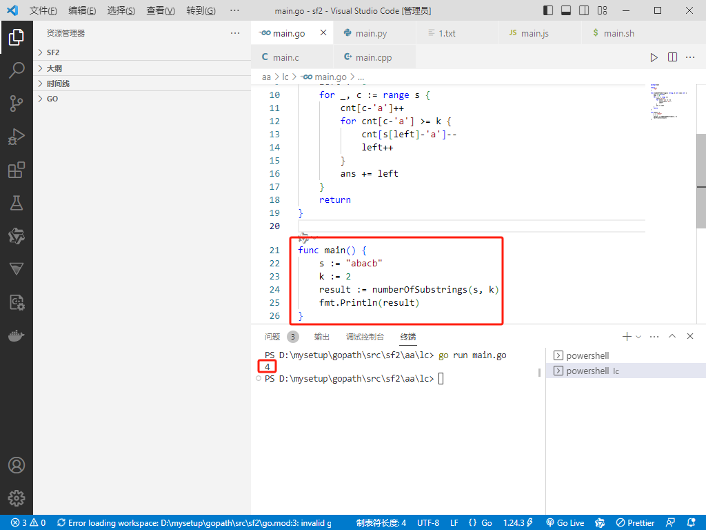 cnt 来记录当前窗口中每个字符的出现次数。left 指针表示窗口的左边界,初始化为 0。ans 为 0。s,每次处理一个字符 c:c 的出现次数 cnt[c-'a'] 加 1。c 的出现次数是否 ≥ k:left 到当前字符)可能包含满足条件的子字符串。left 指针,直到 c 的出现次数 < k:left 时,将 s[left] 的出现次数减 1,并将 left 右移。k。left 的值加到 ans 中:left 到当前字符的所有子字符串都满足条件(至少有一个字符的出现次数 ≥ k)。[left, right],那么以 right 结尾的子字符串中,[left, right]、[left+1, right]、...、[right, right] 都满足条件,共有 left 个。ans 就是所有满足条件的子字符串数量。O(n),其中 n 是字符串 s 的长度。每个字符最多被处理两次(一次被加入窗口,一次被移出窗口)。O(1),因为 cnt 数组的大小固定为 26(小写字母)。package main