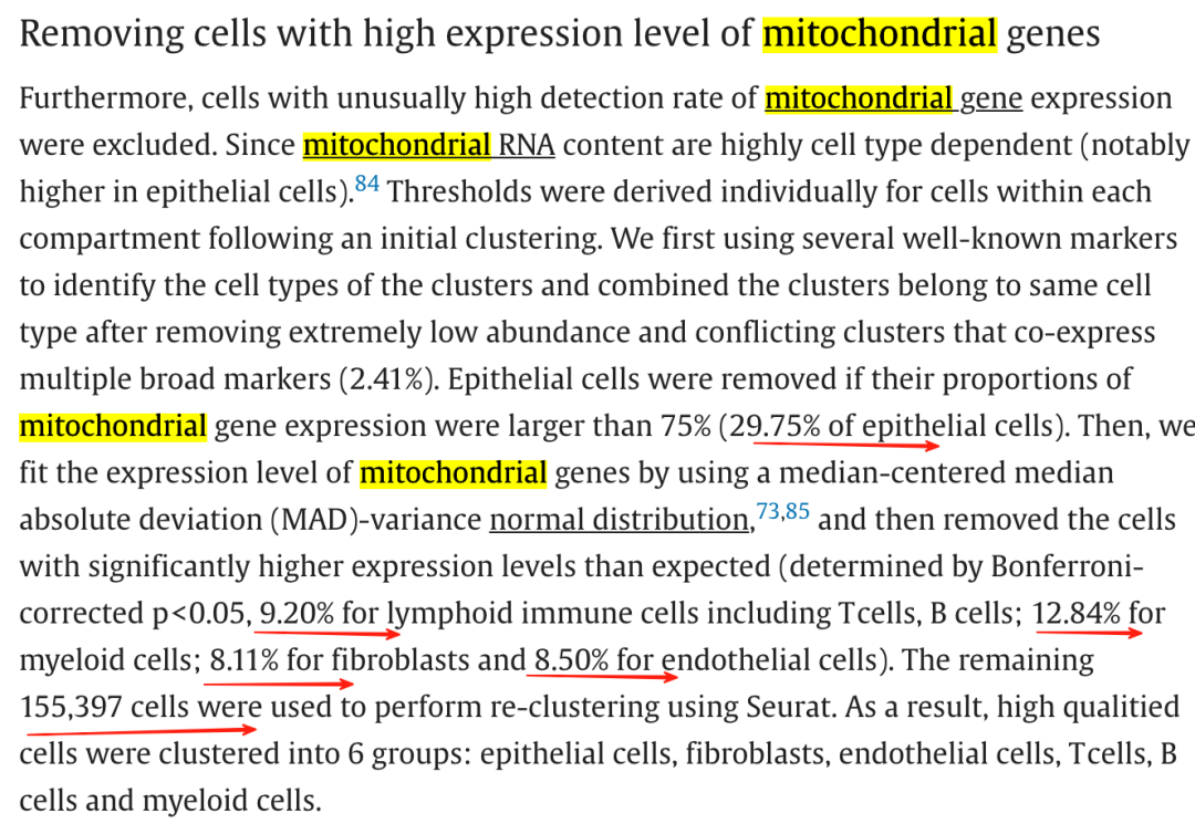 我们也测试了,确实是默认读取 23526 features 个基因, 262943 个细胞, 然后默认过滤就只剩下了8到9万的细胞数量。代码没有问题,仔细的看了看文章,确实是提到了不同单细胞亚群的个性化的线粒体含量过滤标准,如下所示: