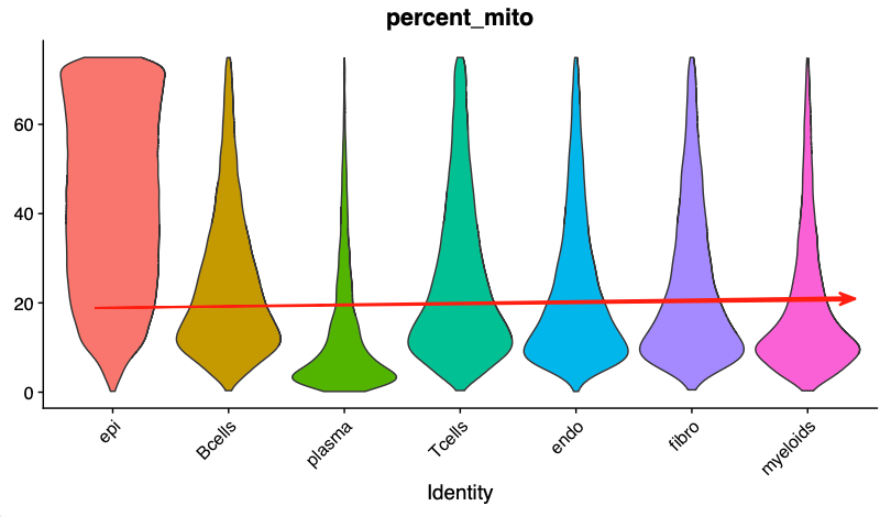 所以我们可以读取后先不要设置线粒体过滤参数,也是可以进行第一层次降维聚类分群并且生物学命名的,可以看到确实是上皮细胞亚群里面的线粒体含量非常夸张,一方面呢是作者的单细胞转录组数据质量确实是不行,另外的话其实不同单细胞亚群的生物学本质不一样,也确实是不应该是一概而论的过滤 :