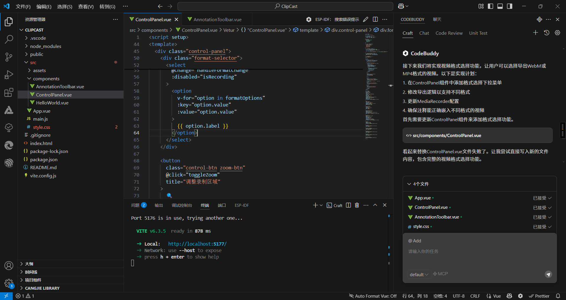 它首先修改了 App.vue,移除了默认的 Vue logo 和多余模板内容,替换成了 ClipCast 的主容器与操作面板。然后创建了两个组件:一个是 ControlPanel,用于控制开始、停止录制;另一个是 AnnotationToolbar,用于添加注释工具。