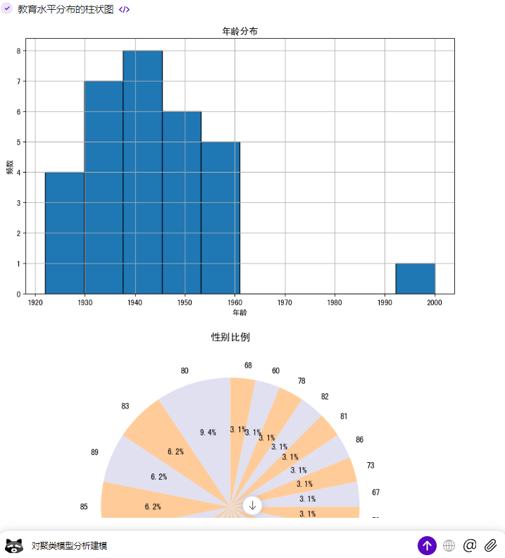 在我不提示的情况下,直接让小浣熊给我进行图形化展示,他会给我很多不同的要生成图形结果,但是由于我需要的是直方图和条形图,通过进一步说明我的需求,小浣熊按照我的要求生成了相应的图表数据。