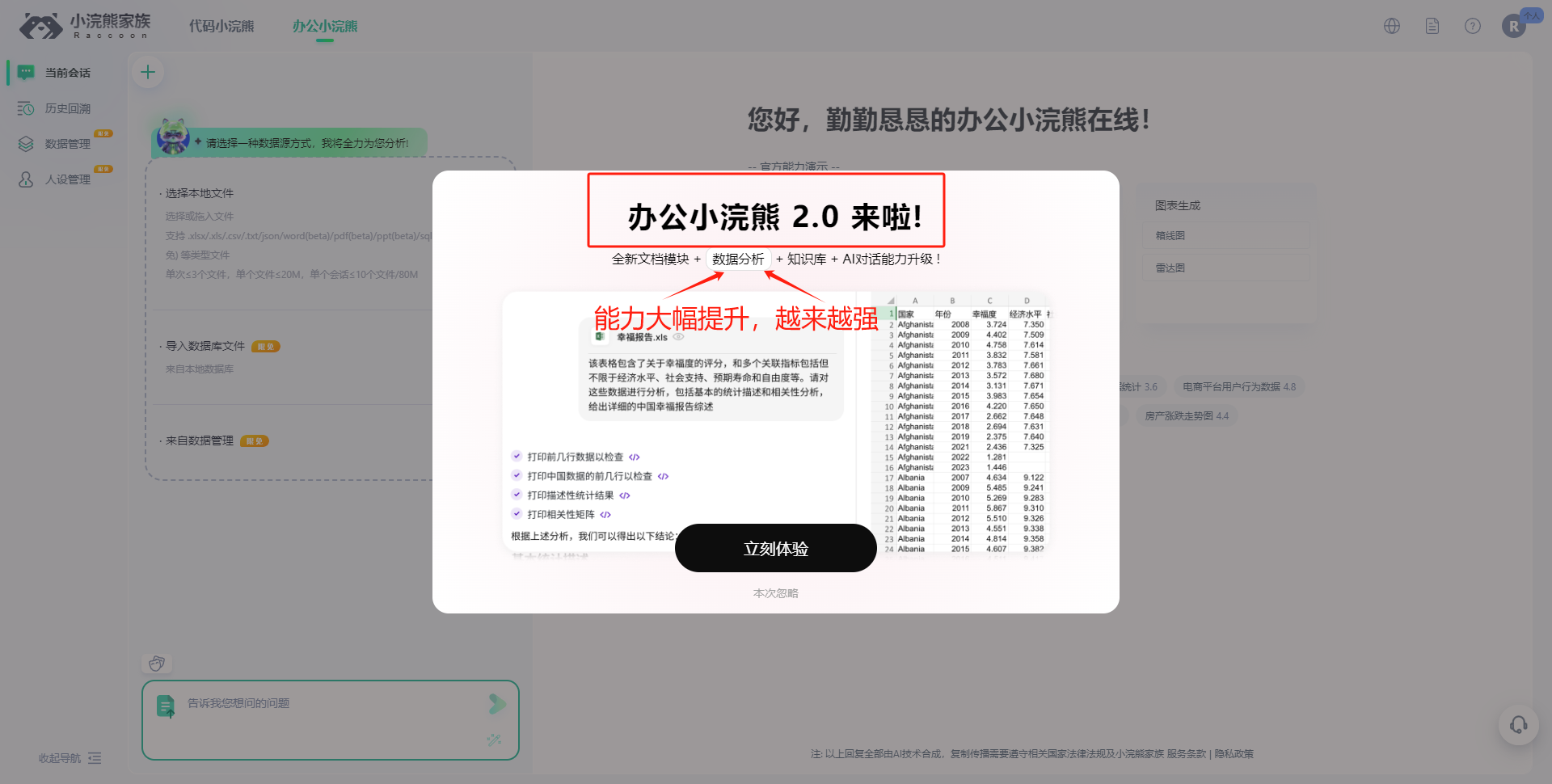 进入办公小浣熊,登录之后,开始体验强大的数据分析能力