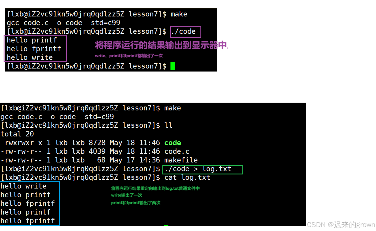 而重定向输出到普通文件中write输出了一次,printf和fprintf输出了两次(准确来说是刷新了两次缓冲区)。