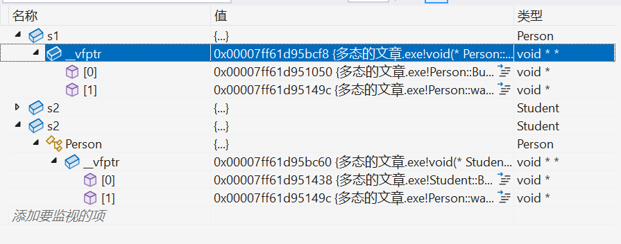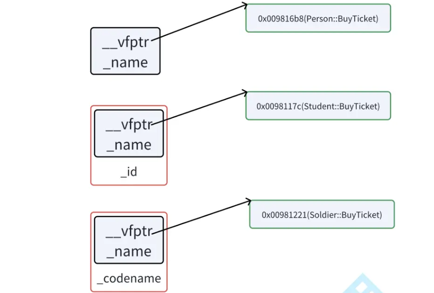 1.基类对象的虚函数表中存放基类所有虚函数的地址。同类型的对象是共用一张虚表的,不同类型的对象各自有各自独立的虚表。通过这个,我们可以知道,基类和子类各有一份自己的虚表,下图就可以知晓: