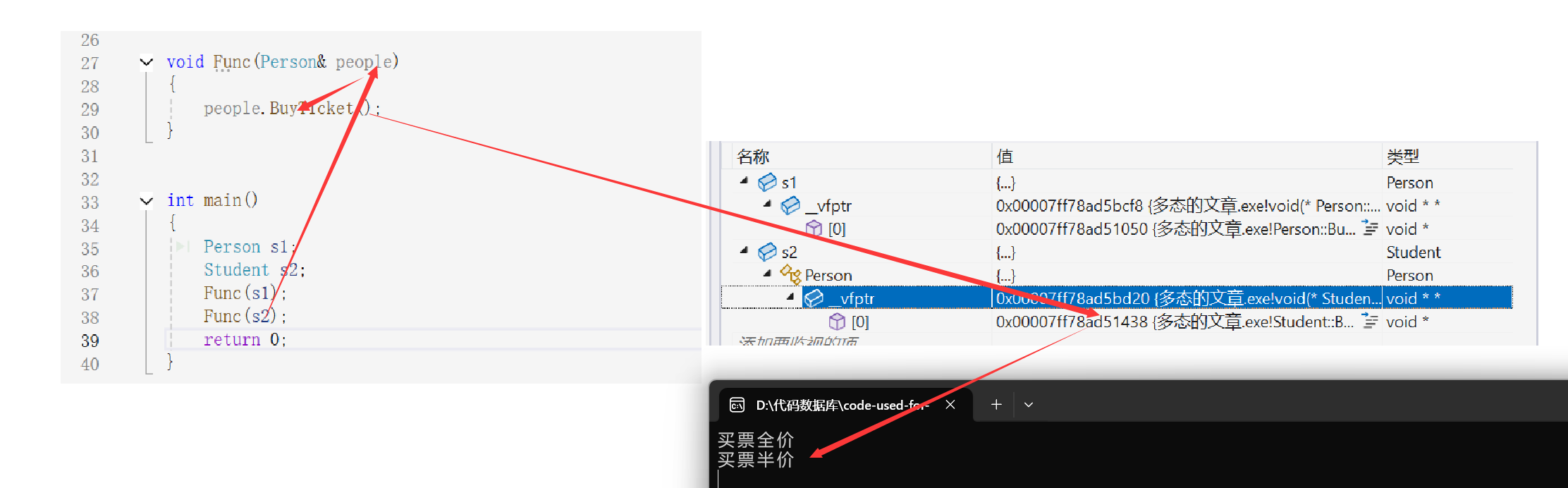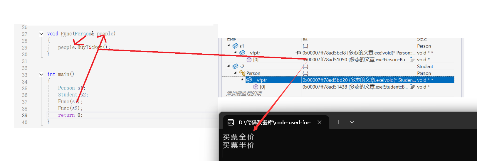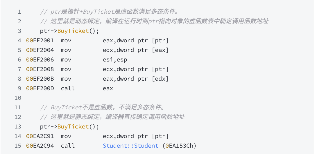 }从底层的角度来看,此时的Func函数中的ptr->BuyTicket(),是如何作为ptr指向Person对象调用Person::BuyTicket,ptr指向Student对象调用Student::BuyTicket的呢?此时通过下图我们就可以知晓。