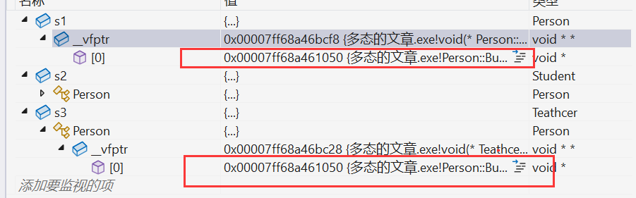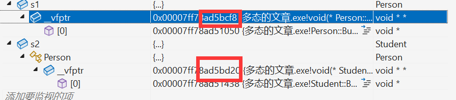 3.派生类中重写的基类的虚函数,派生类的虚函数表中对应的虚函数就会被覆盖成派生类重写的虚函数地址。如果不写的话,基类和子类的虚函数表中虚函数的地址是一样的(虚函数表不一样)。通过下面的代码和图各位就可以知晓这个定义。
