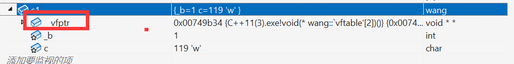 可能到这里很多读者都懵了,这和我学的内存对齐不一样啊?当时我也是这么想的,但是这涉及到了一个新的知识点:虚函数表指针!在wang里面的成员中,除了已经设定好的_b和c,还有一个隐藏的__vfptr指针在这些成员的前面【和平台有关】,它也算是成员,并且它还是一个指针,指针的大小一般是跟随着编译器的环境走的,此时为32位的环境,所以这个指针大小是四字节,4+4+1 == 9,经过内存对齐以后,此时这个对象的大小就是12字节~这也算是一个小小的坑,这个指针我们通过debug以后才可以发现,如下图所示: