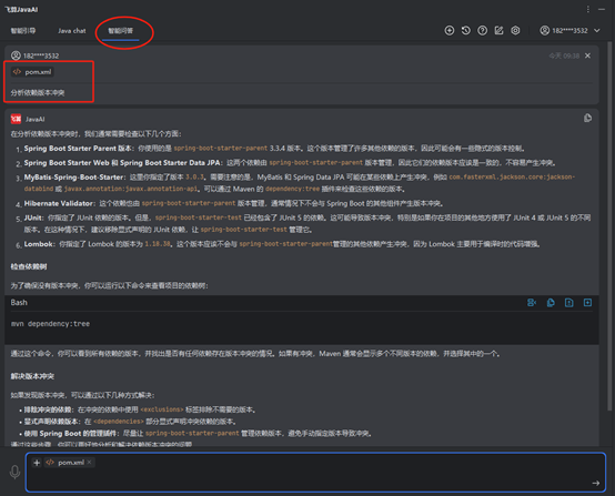 飞算JavaAI 智能问答,能根据上下文,对依赖冲突问题进行解析,并给出解决方案。