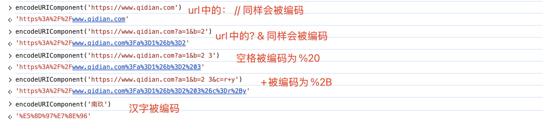 encodeURLComponent除了这些A-Z a-z 0-9 - _ . ! ~ * ' ( ) 不会被编码,其余字符都会被编码