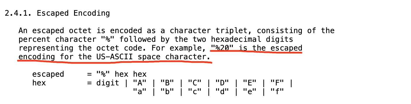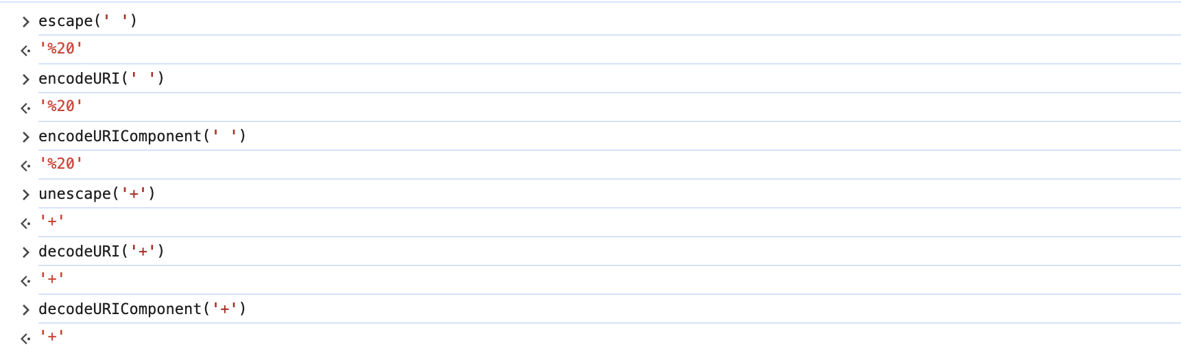 这就是上面出现+变空格的原因,在你不确定正在以哪一个规范进行编解码时,就很容易出现这个问题。它可能是浏览器造成的,也可能是开发语言的规范不同造成的。