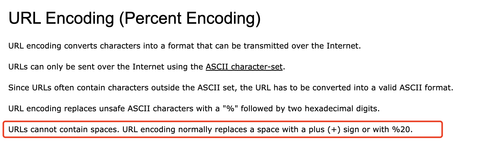 上面分别介绍了URL的编码规范,以及前端编码方法应用的规范。总结下来就是**空格