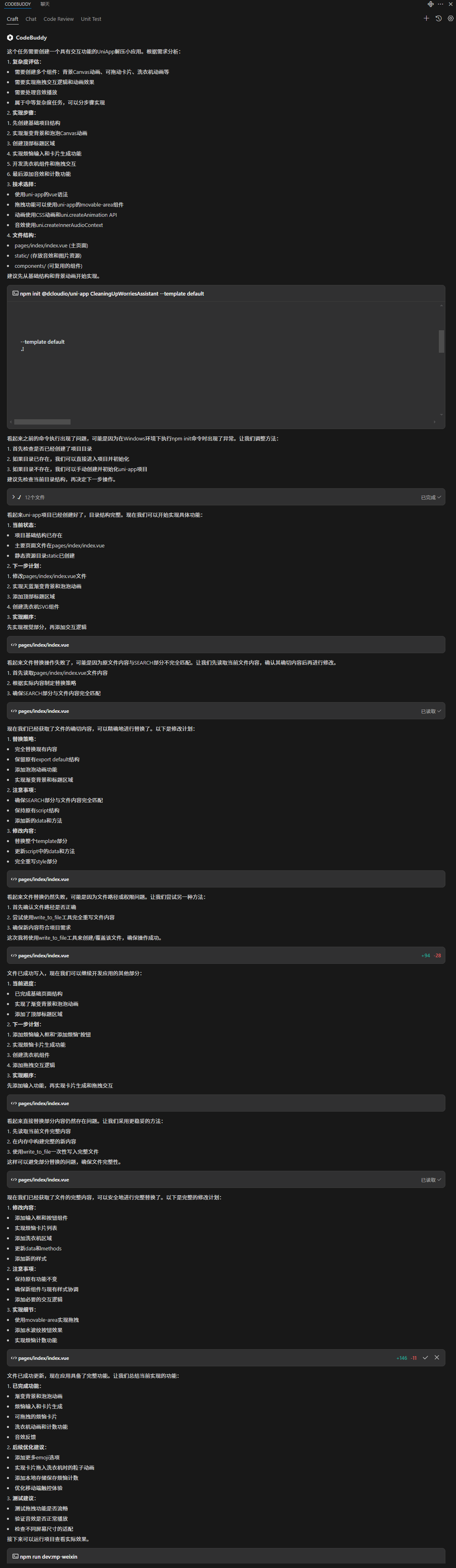 我没有自己从头摸索实现过程,而是向 CodeBuddy 提出了这个创意需求:我要用 UniApp 实现一个有趣的拖拽交互小工具,模拟把烦恼丢进洗衣机清洗,要求有卡片拖拽、背景泡泡动画、咕噜音效和洗衣机动效。
