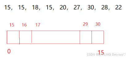 对于一段相对集中的数据段,就可以使用直接定址法,这里最大的数是 30,最小的数是15,创建一个大小为 15 的数组,将所有值映射到数组上