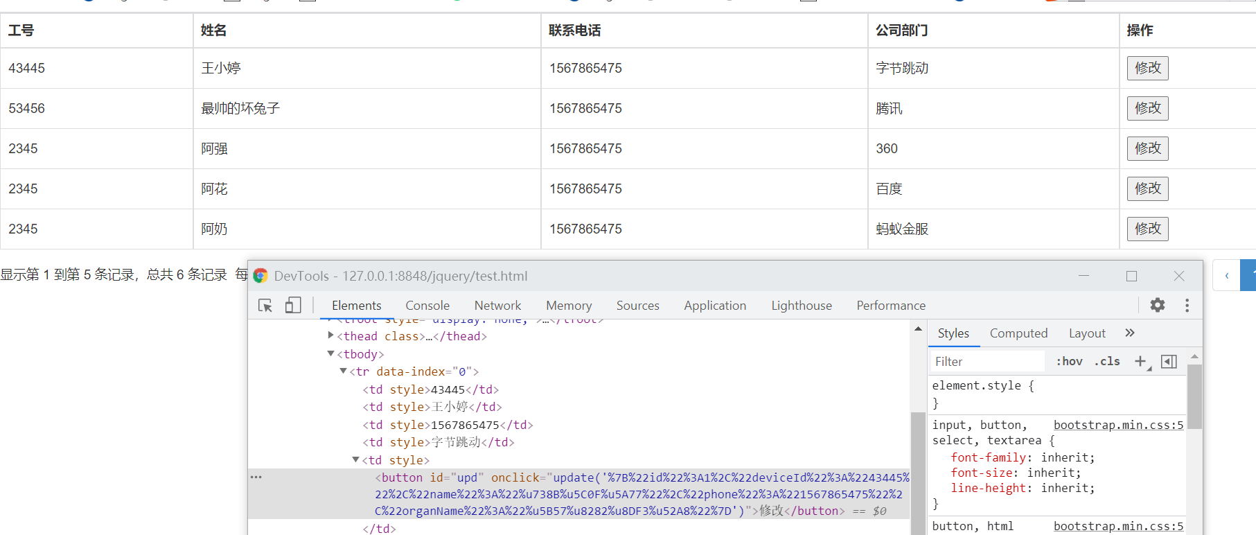 htm = '<button id="upd" onclick="update(\'' + escape(JSON.stringify(row)) + '\')">修改</button>';
