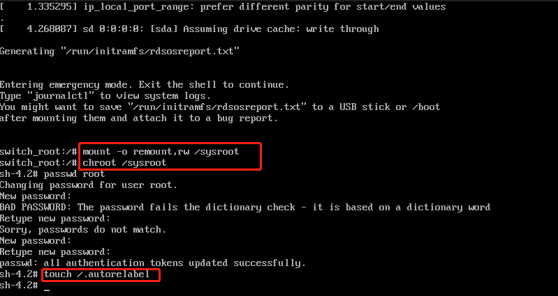 (3)进入bash界面后,执行如下操作,即可完成root密码的重置
