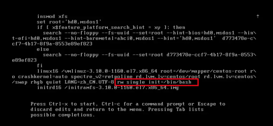(2)按下“e”键后出现如下界面,找到linux16字段,光标移动到末尾,在后面追加rw single init=/bin/bash,然后按ctrl+x启动