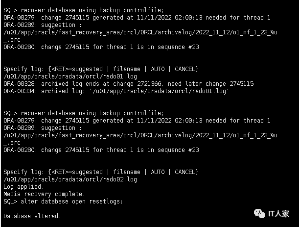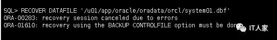 SQL> RECOVER DATAFILE '/u01/app/oracle/oradata/orcl/system01.dbf'结果如下图所示: