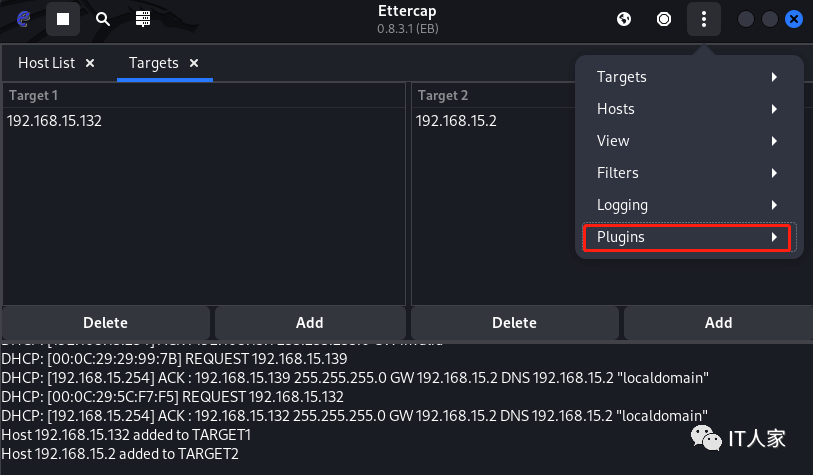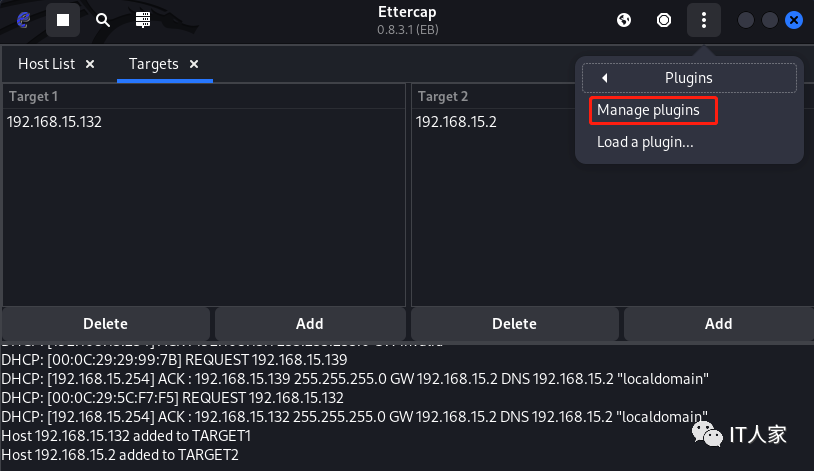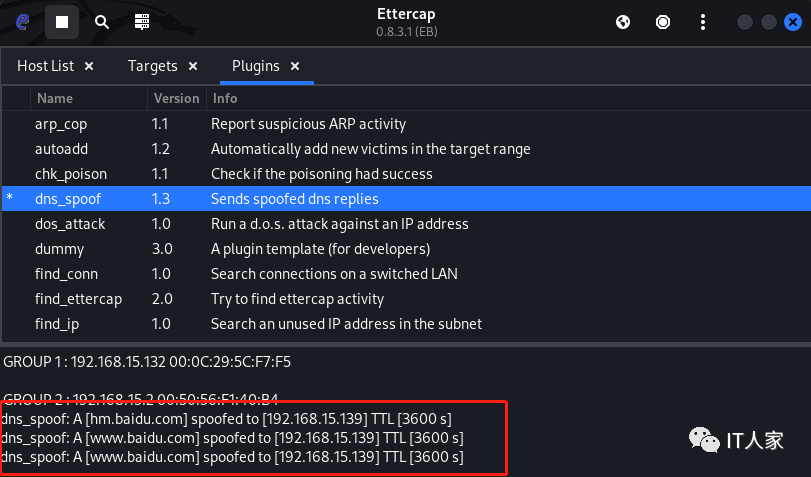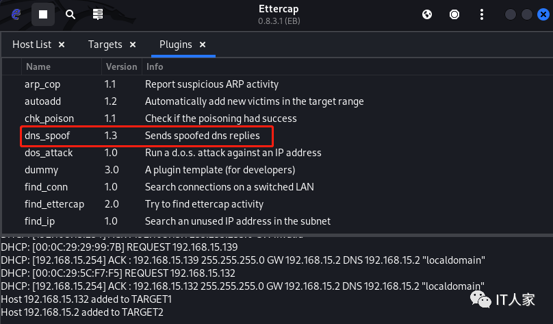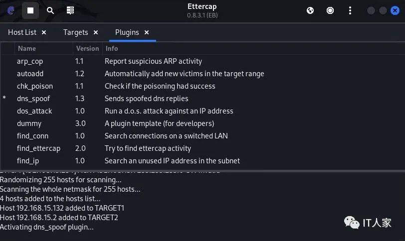 e.双击dns_spoof激活插件,待dns_spoof前面出现“*”号,dns劫持开始