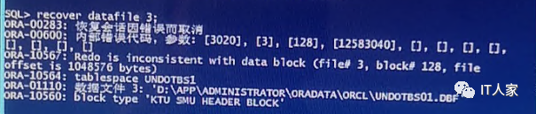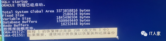 执行startup启动指令后,果然出现错误信息,显示为datafile 3文件异常。这里的datafile 3对应的是undo表空间,在打开数据库时,需要用到undo block 208来回滚没有提交的事务,但是block 208这个块有问题,提示需要恢复。