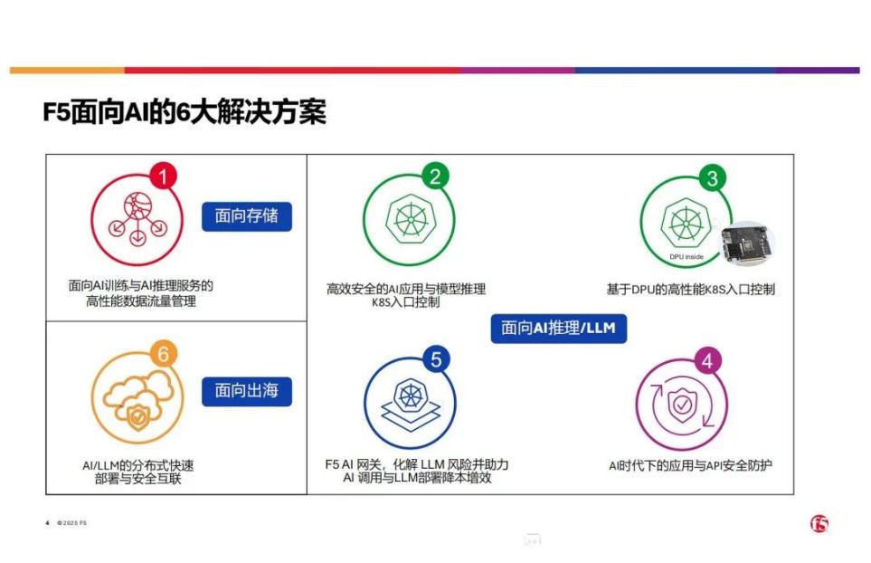 目前,F5通过与行业领先厂商进行深度合作,共同构建六大面向AI应用的创新应用交付和应用安全解决方案,帮助企业加速实现AI驱动的数字化转型目标,同时确保核心业务安全、可靠运行。如F5携手NVIDIA联合发布的AI应用交付解决方案BIG-IP Next for Kubernetes,搭载NVIDIA BlueField-3 DPU赋能加速AI应用交付,以加速、保护和简化流入和流出大型AI基础设施的数据流量。